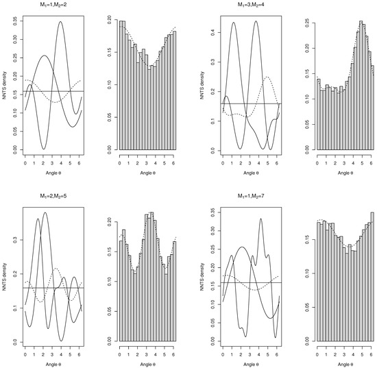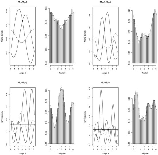 In the case of the sum of two NNTS circular random variables with different values of M, Figure 1 and Figure 2 show the density functions of the two random variables and their sum. In addition, the horizontal line corresponding to the circular uniform density () was included to appreciate the convergence of the sum to the circular uniform density. The plots on the right of Figure 1 and Figure 2 include the histograms of 1000 realisations from the sum of the two univariate NNTS densities; considering realisations from each of the summands and then their sum (modulus 2), the NNTS density of the sum is superimposed on the histograms.