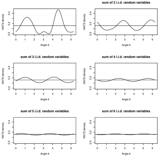 Figure 3 presents, for a simulated case with , the plots of the NNTS densities for the case of independent and identically distributed random variables, in which we add recursively to obtain the density function of the sum of 2, 3, 4, 5, and 6 random variables. From Figure 3, it is clear how the convergence to the circular uniform distribution occurs very fast, with the sum of three or more random variables appearing almost circularly uniformly distributed.