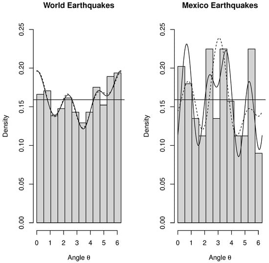 In Mexico, three large-intensity earthquakes occurred on September 19, in recent years: in 1985, 2017, and 2022. Moreover, the 2017 and 2022 earthquakes occurred a few minutes after a simulation drill, which is mandatory by law to prepare the general population for this kind of natural phenomenon. These events have raised concerns among the public about the fact that a large earthquake occurs randomly with respect to time; thus, it is not possible to predict the specific time at which an earthquake of high intensity will occur. It is possible to predict the occurrence of replicas of large earthquakes. We applied the two NNTS ( and ) and the two Hermans-Rasson and Pycke uniformity tests to test the circular uniformity of the times of occurrence of large intensity earthquakes since 1900, when more precise instruments to record the time of occurrence of earthquakes became commonly used. The occurrences of earthquakes with magnitudes greater than 7 (Richter scale) were obtained from the Global Significant Earthquake Database [26]. There were a total of 414 earthquakes in the world, and 85 occurred at latitudes from 33.7828 to 8.8243 and longitudes from −118.8281 to −95.2734, which are mainly earthquakes occurring along the Mexican coast of the Pacific Ocean or in the interior of Mexico. The times of occurrence were transformed into angles by multiplying by the fraction of the year in Julian years at which the earthquake occurred. Figure 5 presents the histograms of the angular values for large earthquakes occurring worldwide and in Mexico from 1900 onwards. By applying the test with , we found that we do not reject the null hypothesis of circular uniformity at a 5% significance level with p-values equal to 0.584 for the world earthquakes and 0.635 for the Mexico earthquakes. When using the test with , the same conclusion was reached with p-values of 0.366 for the world earthquakes and 0.780 for the Mexico earthquakes. In addition, the modified Hermans-Rasson (p-values of 0.407 and 0.728) and Pycke (p-values of 0.424 and 0.797) tests did not reject the null hypothesis of circular uniformity. In terms of the analysis in this study, detecting small deviations from uniformity requires very large sample sizes, and there is no evidence to reject the null hypothesis of circular uniformity with total sample sizes observed from 1900 onwards.
