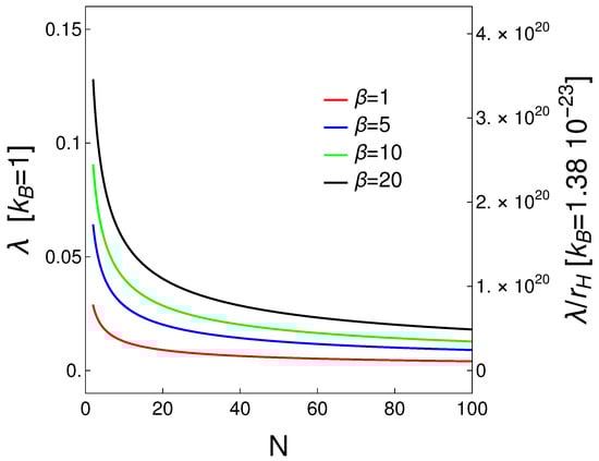 called the de Broglie thermal length. Of course, there is no dimension of length in the Lipkin model, but our scenario contains fermions of mass m (system’s mass ) at the temperature T so that a value can be computed and is up to us to show its relevance to the Lipkin model, which we do below. According to de Broglie convention, very small ’s should indicate classicality. This happens obviously for high T and large N as indicated by (17), as should intuitively be expected.