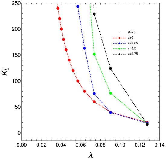 vs. for several v values, obtained by comparing probability distributions pertaining to N versus scenarios. These KL values measure our information loss. We take . When we reach 13 cm, we are in the pure-state range of our indicator, as we saw above. In this pure-state regime, the information loss is so small that it cannot be seen in the vertical scale we have chosen here. Differences are smaller than the dots used there. We see that information loss when we augment N is immensely larger for mixed states than for pure ones.