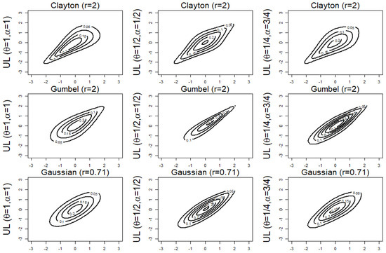 Density contour plots of the QUL-Clayton, QUL-Gumbel, and QUL-Gaussian copulas with standard normal margins and parameters and For Clayton, Gumbel, and Gaussian, the parameter r is selected so that the value of Kendall’s tau is .