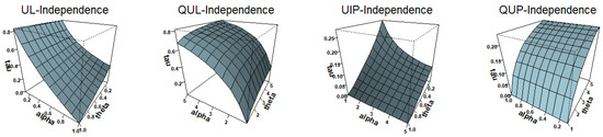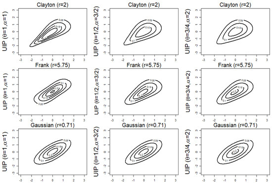 Table 2 indicates that the upper tail dependence coefficient of the UIP- and QUP-distorted copulas is the same as that of the base copula. However, the lower tail dependence coefficients are where and where respectively. That is, the UIP distortion with in Figure 2 and the QUP distortion with in Figure A2 have similar if not the same shapes on the upper right side. Asymmetry is present in QUP-Frank and UIP-Frank when and do not equal 1. The contour plots for UIP-Gaussian and QUP-Gaussian show little change.