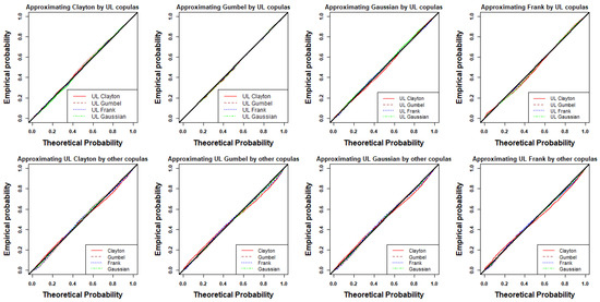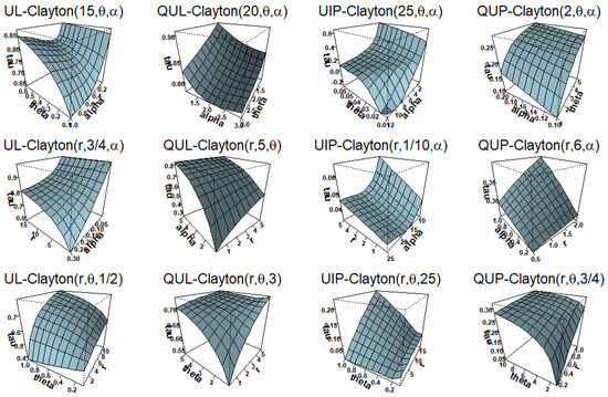 Figure A1 shows that the upper tail dependence tails of QUL-Clayton, QUL-Gumbel, and QUL-Gaussian appear more pronounced than the corresponding base copula for the selected values, similar to those of UL-Clayton, UL-Gumbel, and UL-Gaussian, respectively. The UL- and QUL-distorted copulas have no lower tail dependence when the base copulas have no lower tail dependence. While the parameters are selected so that the contour plots in Figure 1 and Figure A1 show various shapes and sparsities.