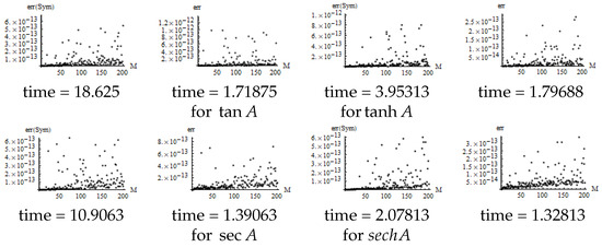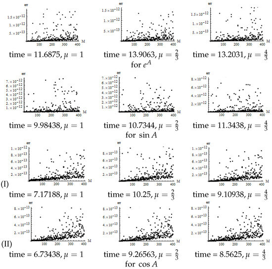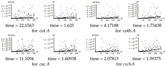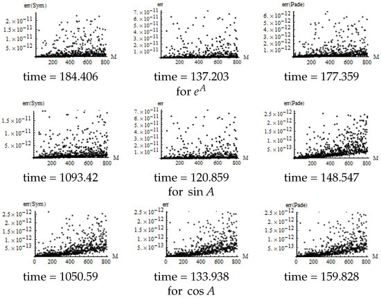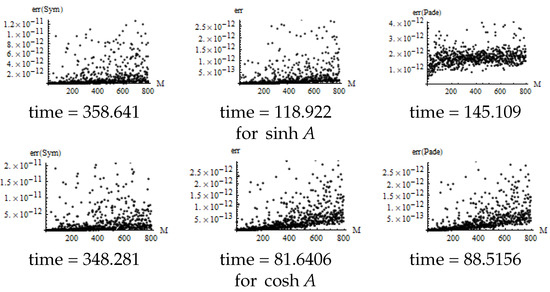 Now let us juxtapose the algorithms presented in Table 1 with the internal functions and commonly used algorithms found in mathematical software. For ease of reference, let denote the calculation error of matrix function , where a blank g implies the utilization of the algorithms in Table 1, Table 2 and Table 3 of this article. If , , it signifies calculation according to the internal function, Padé approximation, respectively. When for respectively. We denote the Padé approximation of as and the Padé approximation of and as In Table 1, the Padé approximation of is as follows: