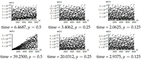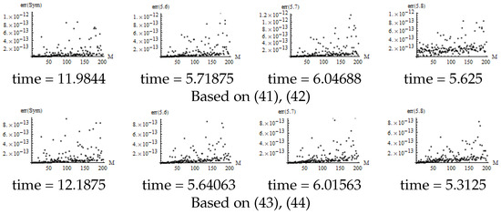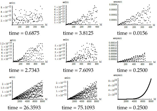It can be seen from Figure 7 that the calculation accuracy of Algorithm 1 is higher than that of Algorithm 3 but the calculation speed of Algorithm 3 is three times that of Algorithm 1. However, the error of numerical results of Mathematica internal functions is far greater than the error of Algorithms 1 and 3. In particular, the collapse is calculated at . After this point, the error increases exponentially with time t. However, Algorithms 1 and 3 are quite stable. For example, the calculation error in is still very small.
