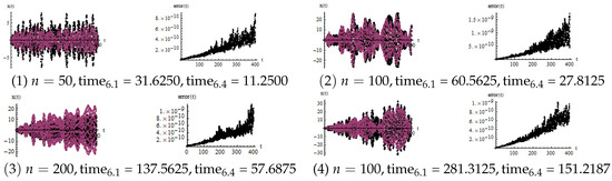 In Figure 9, (1)–(4), the left is the first two components of the numerical solution, and the right is the difference between the numerical solutions obtained by the two algorithms. It is noted that sometimes is close to the frequency of the solution, and flutter or resonance may occur. However, the values obtained by the two algorithms are still very close.