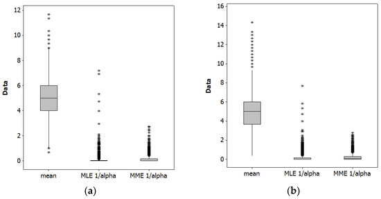 As expected, both estimation techniques yield a sound estimate of the population mean, μ. The techniques furnish different estimates of the dispersion parameter, although both are within the 95% confidence interval of the other’s estimate. The MLEs are zero more often than MMEs are. Most of these zero MMEs actually are negative estimates that have been replaced by zero via truncation (these zero values were employed when calculating the summary statistics appearing in Table 1). These values should be considered infeasible because α is the shape parameter of a gamma RV, and as such must be positive. Figure 2 furnishes a visual box-and-whisker plot—the upper and lower edges of a box denote the first and third quartiles, the internal box line denotes the median, and the whisker tips denote 1.5 times the inter-quartile range (i.e., the third minus the first quartile values)—comparison between the two estimators (i.e., the MLEs and MMEs), highlighting that the MLEs have more outliers (denoted by asterisks). Excessive zeroes and frequency of outlier estimates for MLEs, and negative estimates for MMEs, are among the reasons these estimators are considered inaccurate and/or unstable. One general implication of these results is that neither estimator is particularly good for small samples, but that MME may well be preferable. This small sample case illustrates that an MLE and MME can yield different estimates (also see [17]).