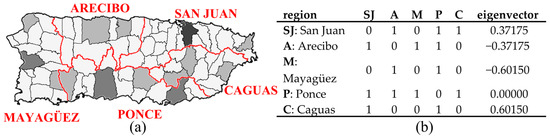 Puerto Rico is partitioned into five agricultural administrative regions, as a scheme applied to it for a century or more, each focusing on one of the island’s major urban areas (Figure 3). The 1899 geographic distribution of population density for this spatial resolution displays excessive extra-Poisson variation (deviance = 1723, which is far greater than its expected value of 1) and moderate PSA. The table in Figure 3b reports the adjusted SWM eigenvector representing this PSA [MC = 0.221, with its maximum (MCmax) being 1.094, and GR = 0.474]. This scenario acknowledges a well-recognized source of over-dispersion, namely correlation among observations (i.e., dependent data, autocorrelation), which is frequent in spatial statistics; for example, SA accounts for roughly half of any detected over-dispersion (e.g., extra-Poisson variation).
