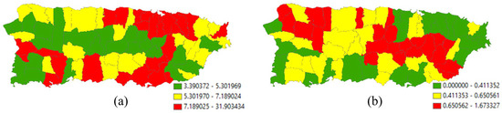 Municipio geographic resolution 2010 population density (i.e., people per square mile) across the main island of Puerto Rico; green, yellow, and red, respectively, denote relatively low, intermediate, and high density values. Left (a): urban population (extra-Poisson variation is 41,183 >> 1). Right (b): rural population (extra-Poisson variation is 1427 >> 1).