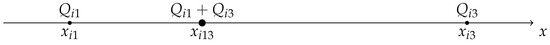 We prove the x-coordinate calculation from Equation (11) taking points and from Figure 1. If we suppose that mass , then , , and their center of gravity are positioned on the abscissa axis as shown in Figure 2.