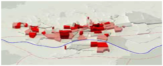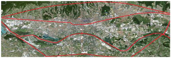 The primary prerequisite was to consider the natural obstacles in the environment. In Figure 4, four red barriers in the City of Zagreb are depicted, from north to south: the mountain, the railway, the river, and the highway.