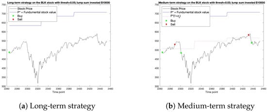 The results on the BLK and ITUB stocks are presented in graphical detail in this paper. Firstly, the long-term strategy on the BLK stock data suggests that the investor buys the stock at time point and holds the stock for the rest of the period. Clearly, this strategy coincides with the B&H strategy and, as a result, profit from the long-term-strategy would be equal to profit from the B&H strategy which is equal to USD1298.04, equaling a 12.98% return on the initial investment of USD 10,000. On the other hand, the medium-term strategy suggests that the investor buys the stock at time points 2265, 2301 and 2437, sells it at time points 2289 and 2431, and holds it for the rest of the time points. This would yield a profit of USD 3391.85; equalling a 33.92% return on the initial investment of USD 10,000 in the nine-month period that the testing set covers. This means that the medium-term strategy beats the B&H strategy by 20.94%. Figure 2 illustrates the long-term strategy and medium-term strategy.