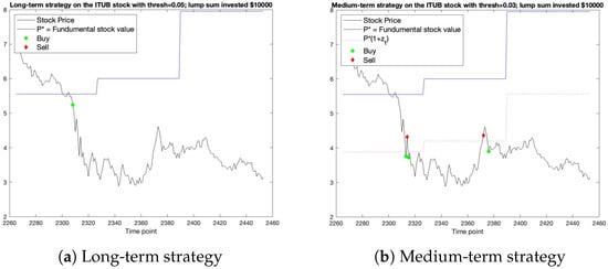 Next, we discuss the ITUB stock data. The long-term strategy suggests that the investor buys the stock at time point 2308 and holds the stock for the rest of the period. Implementing this strategy would yield a loss of USD 3986.16, which equates to a 39.86% loss on the initial investment of USD 10,000. The buy-and-hold strategy, however, would yield a greater loss of USD 5584.67. In contrast, the medium-term strategy suggests that the investor buys the stock at time points 2313, 2315 and 2376, sells it at time points 2314 and 2372, and holds it for the rest of the time points. This would actually yield a profit of USD 909.81. Although this is only a 9.1% return on the initial investment of USD 10,000, the medium-term strategy provides the investor with a strategy whereby he or she can make a profit in a period when the stock is actually crashing. Figure 3 illustrates the long-term strategy and medium-term strategy, respectively.
