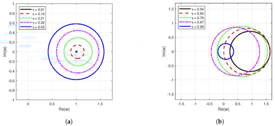 The stability of the numerical scheme is determined by the eigenvalues of . The stability region of the numerical scheme (28) is typically defined by the set of points in the -plane for which the spectral radius or the modulus of dominant eigenvalue is less than or equal to 1. If there is more than one non-zero eigenvalue with the potential to cross the stability threshold of 1, the stability region is then determined by considering these eigenvalues and the regions where these eigenvalues have a magnitude less than or equal to 1. The overall stability region of the numerical scheme would then be the intersection of these regions. If the stability region includes (the entire left half of the -plane), then the numerical scheme is said to be absolutely stable (A-stable) [58]. If, in addition to A-stability, the limit of the dominant eigenvalue tends to zero as w tends to , then the numerical scheme is said to be Lubich-stable (L-stable) [59]. The L-stability property means that any components that may cause instability in the numerical scheme are damped as the length of the sub-domain, , increases, which is particularly important when handling long-term integration of stiff differential equations. To illustrate, Table 1 shows the dominant eigenvalue, stability region and stability property for a linear discretization () of Equation (28) with two sub-domains () for some selected values of fractional order . As shown in the table, the stability region of the numerical scheme is the exterior of some closed disks in ; the boundaries of these disks are illustrated in Figure 1. As indicated by the figure, the stability regions for satisfy the conditions for absolute and Lubich stability, and so the numerical scheme for these values of is absolutely and Lubich-stable. However, the numerical schemes for are not absolutely stable and, by extension, not L-stable.