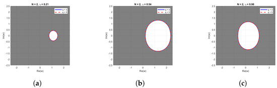 In Figure 2, the stability regions for a quadratic approximation with and for are presented. The stability region in the figure is the area outside the elliptical disks, which shows that the stability regions for and sub-domains are the same. However, in both cases, a varying number of eigenvalues with the potential to cross the stability threshold are obtained. For , there is one non-zero dominant eigenvalue for and , and there are four non-zero eigenvalues for with the potential to cross the stability threshold of 1. For , all have eight non-zero eigenvalues that can cross the stability threshold. However, when the intersection of the resulting stability regions from these eigenvalues is taken, the same stability region with is obtained for each illustrated value, as shown in Figure 2. The figure shows that the numerical schemes for and are absolutely stable, and the scheme for is not absolutely stable (conditional stability). Although a general conclusion about the stability of the numerical scheme cannot be made, it can be inferred from this analysis that whether the numerical scheme is absolutely or conditionally stable depends on the value of the arbitrary non-integer order of the fractional differential equation.