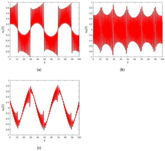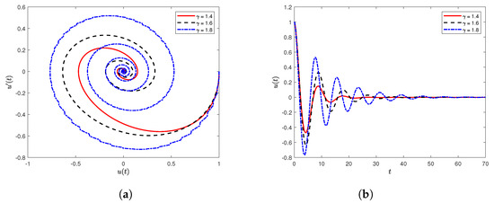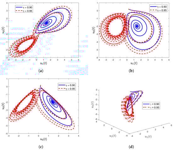 Figure 9 shows the phase portraits of the chaotic system in Equation (39) using two different values. The figure justifies that the dynamics of the chaotic system depend on the arbitrary real order.