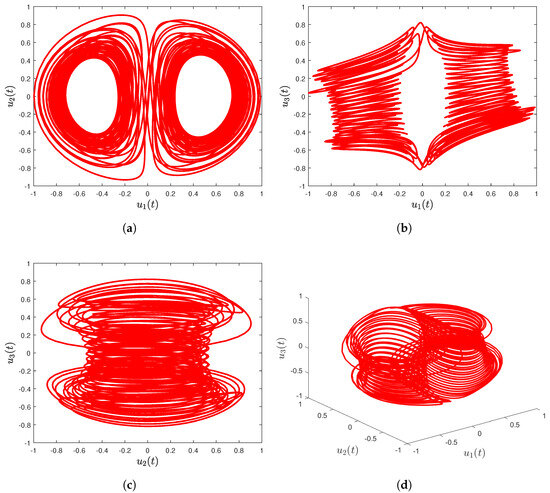 The phase portraits of the chaotic systems (39) for the (a) plane, (b) plane, (c) plane and (d) surface with and .