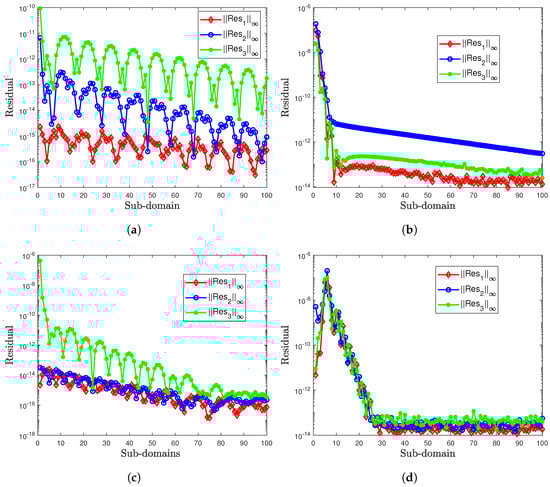 To further validate the accuracy of the proposed multi-domain method, the infinity norm of the residual for different numbers of sub-domains is presented. Table 7 gives the infinity norm of the residual errors for Example 4. The residual error is obtained through the discrete equivalent of Equation (34), defined by