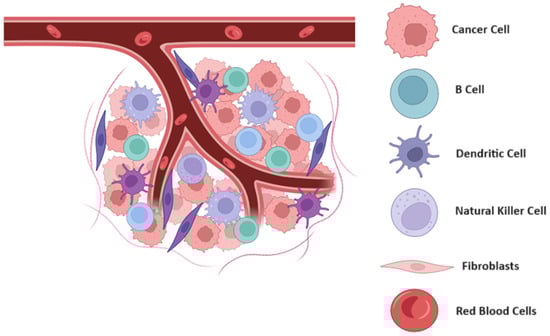 Recent advancements in mathematical modeling have significantly enhanced our understanding of the tumor microenvironment (TME) (see Figure 1), emphasizing its complexity and heterogeneity. These models integrate various biological, physical, and chemical processes to simulate the interactions between cancer cells and their surrounding stromal and immune components. For instance, sophisticated models have been developed to capture the dynamics of tumor angiogenesis, the immune response, and the influence of the extracellular matrix on cancer progression [18,19,20,21,22]. Such models are crucial for predicting tumor behavior under different therapeutic scenarios, enabling personalized treatment strategies and optimizing clinical outcomes. By providing a detailed representation of the TME, mathematical models are pivotal in identifying potential therapeutic targets and understanding the mechanisms of resistance, thereby paving the way for more effective cancer treatments.
