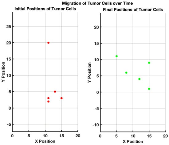 Migration of tumor cells over time. (Left): initial positions of tumor cells. The scatter plot illustrates the random initial distribution of five tumor cells on a 20 × 20 grid. Each red point represents the starting location of a tumor cell before migration. (Right): final positions of tumor cells after 50 steps of random migration. The scatter plot shows the new positions of the same tumor cells after undergoing 50 steps of random movement within the grid. Each green point indicates the location of a tumor cell following the migration process.