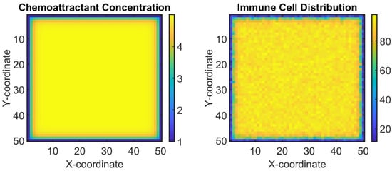 This figure illustrates the dynamic interaction between tumor cells and immune cells within the tumor microenvironment. In the left subplot, the color map represents the spatial distribution of the chemoattractant produced by tumor cells, which forms a gradient attracting immune cells towards the tumor site. In the right subplot, the distribution of immune cells recruited to the tumor site based on the chemoattractant gradient is depicted. Immune cells are recruited to regions with higher chemoattractant concentrations, reflecting their response to tumor-derived signals within the microenvironment. Overall, this simulation represents a simplified model of the biological interaction between tumor cells and the immune system, highlighting key processes, such as the production and diffusion of signaling molecules and the recruitment of immune cells in response to those signals. It provides a computational framework to examine how local concentrations of chemoattractants can influence the immune environment in the context of cancer biology.
