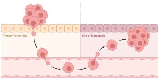Schematic representation of metastatic cancer. This schematic illustrates the multi-step process of cancer metastasis, highlighting key stages, including local invasion, intravasation into the bloodstream, circulation through the vascular system, extravasation into distant tissues, and colonization to form secondary tumors. The diagram also depicts the interaction between cancer cells and the tumor microenvironment, including stromal cells, immune cells, and the extracellular matrix, which influence the metastatic process. The figure underscores the complexity of metastatic spread and the critical role of various microenvironmental factors in facilitating cancer progression to distant sites. Figure created using Biorender.