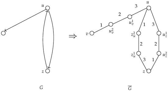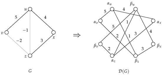 The proof of the above theorem exploits the technique introduced in []. Let be an undirected signed weighted graph; the display graph of G is the undirected unsigned weighted graph derived from G as follows (Figure 1):