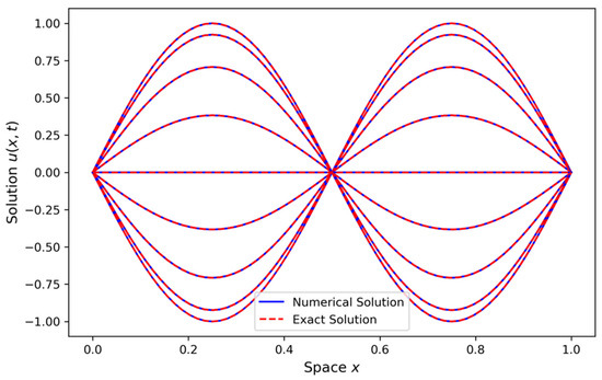 The graph above illustrates the comparison between the numerical solution and the exact answer for various time increments. The numerical solution (solid blue line) is obtained using a finite difference scheme, while the exact solution (dashed red line) is derived analytically. This graphic comparison illustrates the precision of the numerical method in estimating the exact solution over time. The wave speed is designated as . The spatial domain is divided into intervals, and the time domain is similarly divided into intervals, resulting in grid spacings of for space and for time. The initial condition is defined as , whereas the exact solution is expressed as The numerical solution closely approximates the exact solution at every timestep. This study employs the finite difference approach, which offers a stable and precise approximation of the wave equation.