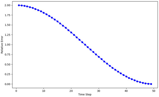 In this part, we investigate the relative error of the finite difference method implemented on the wave equation. We aim to grasp the accuracy of our numerical solver all through the simulation by analyzing the highest relative error at every timestep.