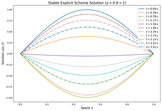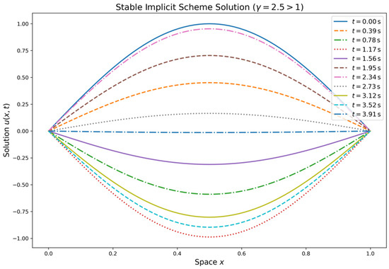 Figure 5 shows the numerical solution from the explicit scheme over time (in seconds). The spatial domain is discretized, and the solutions at key time points are shown, highlighting the evolution of the solution over time. Figure 6 shows an unstable solution from the same explicit scheme, showing instability as the CFL condition is exceeded. Figure 7 also violates the CFL condition, and the solution is still stable. This ensures that implicit scheme is unconditionally stable and that we choose larger timesteps for the computation. The spatial domain is discretized, and the solutions at key time points illustrate the scheme’s stability. The initial condition is considered as for all of the above three cases with both spatial and time domain units.