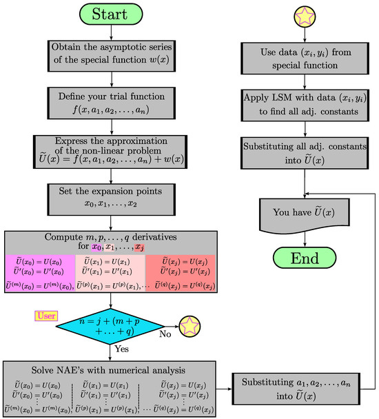 Figure 1 illustrates the flowchart of the Leal method for approximating special functions, detailing the necessary steps. For instance, it includes the derivation of the asymptotic series of the special function represented by and the approximation . An important aspect to note is the criterion within the diagram. If this criterion is satisfied, the first variation of the Leal method is applied, solving for the a parameters. Otherwise, the problem is solved differently, and the remaining constants are determined using the least squares method (LSM).