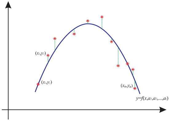Let (), (), (), ⋯, () be the coordinates of a data set, such that , and the adjustment curve is , where () are adjustment constants. The least squares approximations attempt to minimize the sum of the squares from the vertical distances of values to the ideal model and obtain the model function , which minimizes the square error defined by
