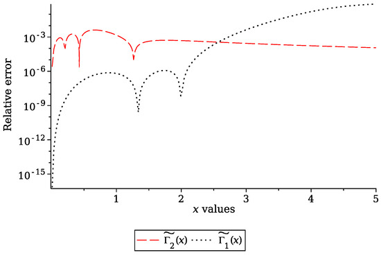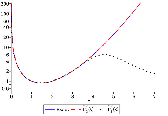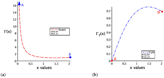 It is important to remark on some key aspects of this process for both variations of the method. is obtained by means of asymptotic techniques and its variations. This means that we assured the accuracy of for the limit behaviour of at or . Another aspect to consider is that TF can be formulated using polynomial terms, rational polynomial terms, transcendental functions, and combinations, as long as its effect over vanishes as reaches the limit region. Furthermore, it is important to note that the solution of (3) produces a symbiotic relationship between f and w in order to enlarge the domain of convergence of . What is more, optionally, can be transformed into another function in order to simplify or ease the approximation of the limit region. In this case, we apply the same procedure to obtain . Later, we apply the inverse transform to recover the approximation of the original nonlinear problem. The multiple expansion points aid to spread the error among them, extending the convergence domain of the approximation. Finally, the application of is optional if and are adequately proposed to model the limiting behaviour, as we will see in the case study of Gamma function.