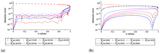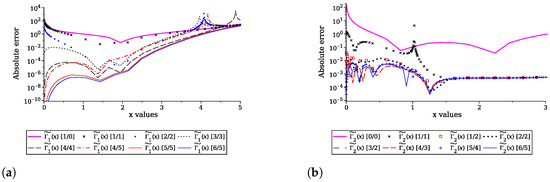 - If with j expansion points, then we solve (3) symbolically for variables and finally use the least squares method with the remaining variables to fit with respect to . The suggested interval to perform the fitting is the zone that exhibits the poorest accuracy for the pure asymptotic solution ().