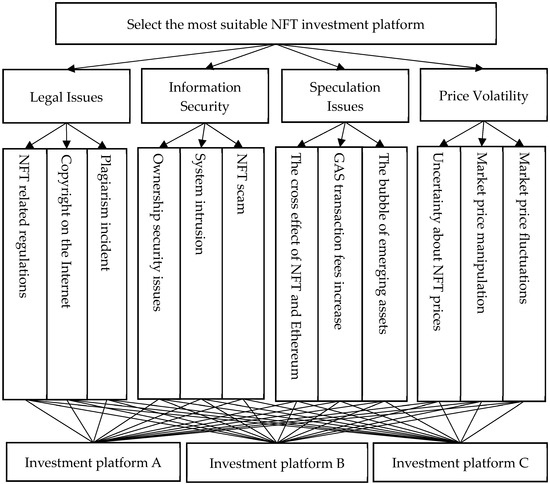 According to the latest data from CryptoSlam, as of November 2024, NFT sales have approached USD 7.43 billion, with trading profits exceeding USD 33.303 million. In the buyer–seller market, the potential demand for NFT transactions continues to grow, leading to rapid development in the NFT market and giving rise to various issues, such as price manipulation, counterfeit products, hacking of investment platforms, identity verification errors, data leaks, and wallet security failures, all of which have caused significant financial losses for investors. Currently, the NFT investment market faces challenges such as legal uncertainty, information security, and high price volatility due to speculation. This study conducted expert interviews and adopted a two-stage research methodology to analyze the most common risk factors when selecting NFT investments. It employed the Decision-Making Trial and Evaluation Laboratory (DEMATEL) and the Analytic Network Process (ANP) to explore risk factors such as legal issues, security concerns, speculation, and price volatility, aiming to understand how these factors influence investors in choosing the most suitable NFT investment platform. The survey was conducted between February and June 2023, targeting professionals and scholars with over 10 years of experience in the financial market or financial research, with a total of 13 participants. The empirical results revealed that speculation had the greatest impact compared to legal issues, security concerns, and NFT price volatility. Speculation and price volatility directly influenced other risk factors, potentially increasing the risks faced by NFT investment platforms. In contrast, legal and security issues had less influence on other factors and were more affected by them, indicating a relatively lower likelihood of occurrence. Thus, investors must be cautious of short-term speculation, particularly when dealing with rare NFTs. The best approach is to set an exit price to minimize potential losses if the investment does not proceed as planned.