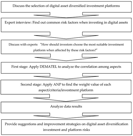 This study applies the DEMATEL method to analyze the causal relationship structure of NFT risk factors, followed by the ANP to evaluate the weight of these risk factors and to select the most suitable NFT investment platform. The survey was conducted between February and June 2023, targeting professionals and scholars with over 10 years of experience in the financial market or financial research, with a total of 13 participants. The experts’ opinions were consolidated and analyzed. The research design process is shown in Figure 2.