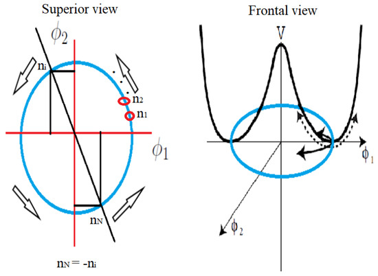 Typical potential when there is a vacuum degeneracy. In such a case, the system selects one among the N possible ground states. Before the symmetry is broken, for each possible vacuum , we have a diametrically opposite vacuum obeying . This can be interpreted as the emission of antiparticles when the appropriate vacuum state is selected during the breaking process.