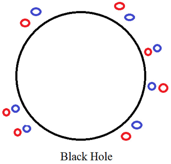where the subindex stands for “before formation” of the black hole. Then, it is possible to recover all the information for the black hole by summing all the possible outcomes of the order parameter evaluated at their corresponding ground states, taking the order parameter as the particle number operator. When the emitted field represents a particle, then , and when the emitted field represents an antiparticle, . This means that half of the degenerate ground states () correspond to the emission of particles, while the other half () represent antiparticles. Once the black hole selects one among the infinite ground states, then it starts to emit particles. The selection of a single ground state among many requires an external perturbation. The external perturbation could be the presence of another source of gravity, universe expansion itself, or the presence of other virtual pairs in the vicinity. Normally, the origin or source of the perturbation is not so relevant, because its influence has to be considerably small once the conditions for symmetry breaking are reached. Figure 3 illustrates this issue, where virtual pairs are generated in the neighborhood of the black hole. For the emission process to occur, there must be a special orientation for the pair with respect to the event horizon; in other words, one particle from the pair can enter the event horizon when the right orientation, with respect to the event horizon, is established. Particular orientations of the virtual pairs at certain instants are defined by external perturbations.