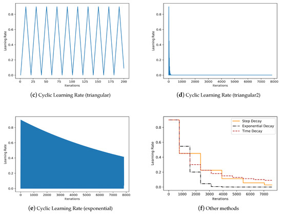 - Inverse Time Decay: In Inverse Time Decay, the learning rate is decreased based on the time elapsed in the training process [24]. This is achieved by dividing by a factor corresponding to the number of epochs. Specifically, the learning rate in each epoch obeys the following rule:where is the initial learning rate, t is the epoch number that is being executed at a particular instance of the training process, is the decay factor, and is the number of epochs after which the learning rate needs to be updated.