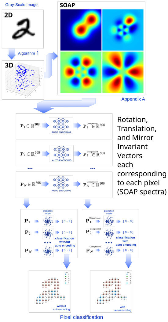 Figure 1. In our study, we take gray-scale MNIST handwritten images as input and project them into 3D point clouds. These points are then processed using the SOAP algorithm to generate SOAP spectra—feature vectors that encode local environments while remaining invariant to rotation, translation, and mirror symmetry. Each vector can be labeled and used for classification or regression tasks with models such as feed-forward neural networks. Due to SOAP’s inherent symmetry invariance, data augmentation for rotation, translation, and flipping is unnecessary during training. Additionally, since some SOAP components are highly correlated, dimensionality reduction techniques such as autoencoding or PCA can be applied for compression.