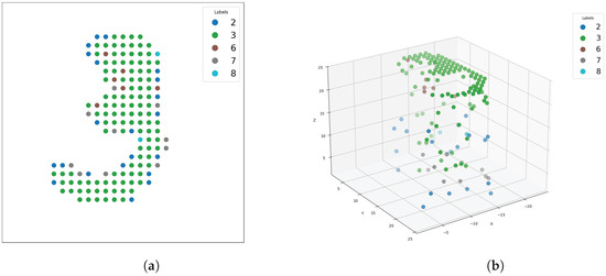 Figure 13. (a) A simple handwritten 3. (b) A 3D projection of the pixel data, illustrating that points far from the primary shape are predicted less accurately. (a) Handwritten 3. (b) 3D projection of (a).