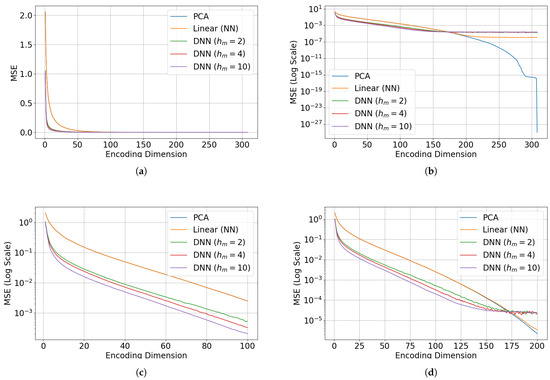 Figure 18. PCA dominates the MSE accuracy from 308 until around 200, then PCA and linear model become identical. Below around 175, deep autoencoding becomes more accurate, and there is not much difference between h m = 2 , 4 and 10. (a) Encoding MSE from 0 to 308, linear scale. (b) Encoding MSE from 0 to 308, logarithmic scale. (c) Encoding MSE from 0 to 100, logarithmic scale. (d) Encoding MSE from 0 to 200, logarithmic scale.