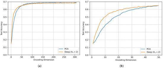 Figure 19. The linear model and deep model both perform similarly, with PCA giving slightly better accuracy over h e = 50 , and deep autoencoding giving slightly better accuracy over h e = 50 . (a) Test accuracy for compression dimension between 0 and 308 with the linear model (PCA) and deep autoencoding ( h m = 2 ). (b) Test accuracy for compression dimension between 0 and 50 with linear model (PCA) and deep autoencoding ( h m = 2 ).