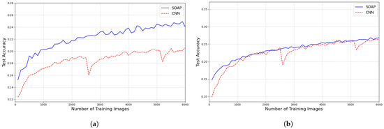 Figure 21. Comparison of SOAP and CNN test accuracy under rotation. Each training image consists of a 15 × 15 local patch extracted from MNIST digits. All test images are randomly rotated. Classification is performed on the center pixel of each patch. Training sizes range from 100 to 6000 samples, in steps of 100. Each point represents the average over 10 training runs. (a) Test accuracy using non-augmented training data; test images are randomly rotated. (b) Test accuracy using both rotated training and test data.