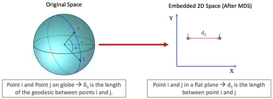 To help illustrate the role of and in the stress function, and to clarify the transformation performed by MDS, Figure 1 provides a schematic comparison between the original geographic space and the resulting 2D embedded space. In the original space, the dissimilarities correspond to geodesic (Haversine) distances over the Earth’s surface. After applying MDS, these curved distances are approximated by straight-line Euclidean distances in a flat 2D space. The “stress” measures how well these straight-line distances preserve the original geodesic structure.