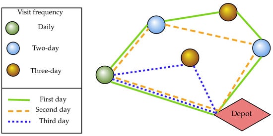 The main objective of the PVRPTWs is to minimize total transportation costs or time across the entire planning horizon while satisfying all customer needs and complying with operational constraints [17]. A simplified representation of the PVRPTWs is illustrated in Figure 2.