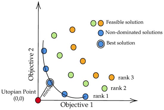For problems with multiple objectives, multi-objective genetic algorithms (MOGAs) are used. These algorithms generate a set of solutions that offer trade-offs between objectives, represented by the Pareto front. In MOGAs, a Pareto solution dominates another if it is at least as good in all objectives and strictly better in at least one. The Pareto front consists of all Pareto-optimal solutions, representing the best trade-offs [32], as visualized in the combined schematic shown in Figure 3, which integrates the ranking of solutions by Pareto dominance and the selection of the best solution using the utopian point.