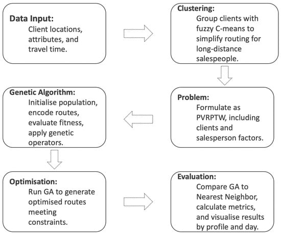 Workflow of the proposed hybrid multi-objective genetic algorithm approach, highlighting the integration of clustering, heterogeneous salesperson modeling, and multi-criteria optimization.