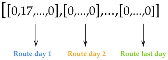 Each solution is represented as a Python list, where each sublist corresponds to a day and contains the ordered client visits for that day, as illustrated in the Figure 5. This structure provides a clear and flexible way to model multi-day routes and simplifies manipulation during optimization.